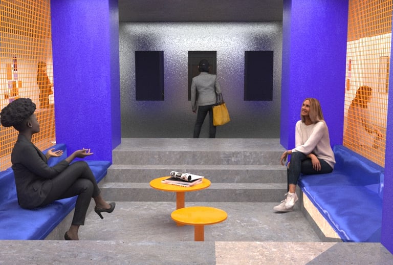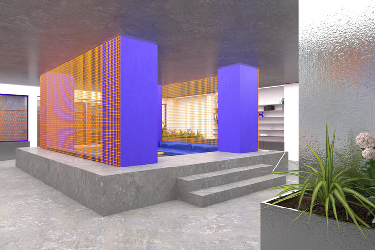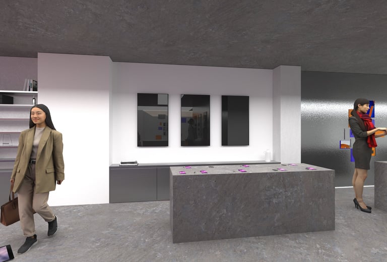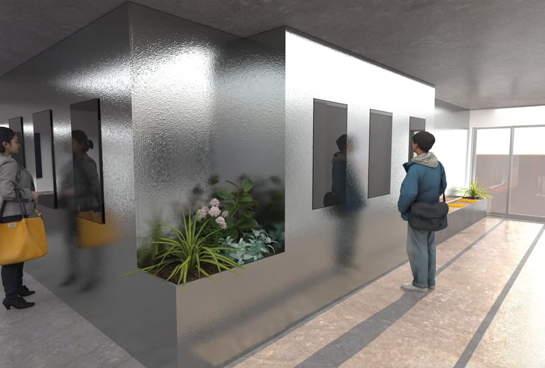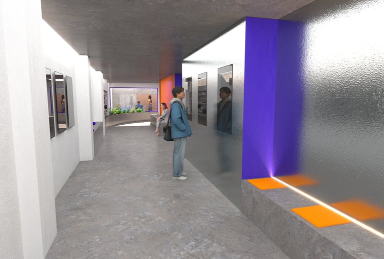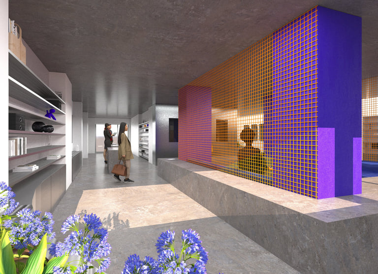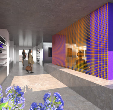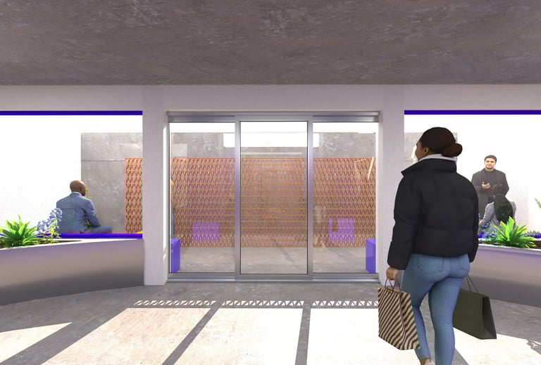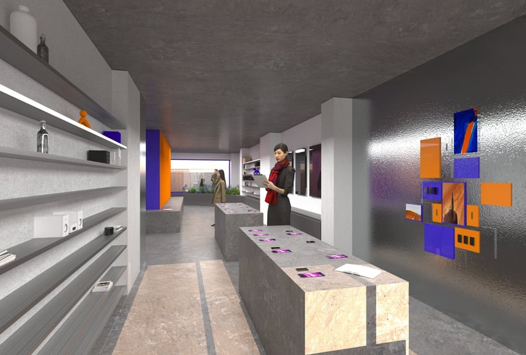Diseñamos un espacio moderno y relajado con una plataforma central para interactuar cómodamente con los productos. La tienda cuenta con dos accesos: uno para nuevos clientes y otro para compras rápidas de habituales.